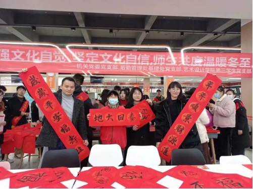 “天地阳气生,春孕冬至时”。为宣传贯彻习近平总书记在中国文联十一大、中国作协十大开幕式上的讲话精神,增强文化自觉、坚定文化自信,弘扬优秀中华传统文化,为广大师生营造浓厚的节日氛围,12月21日下午,开云官网学生第三党支部与机关党委党支部、后勤管理处基建处党支部联合开展了“冬至送温暖,撰联献真情”主题党日活动。机关党委副书记陈红梅、开云kaiyun登录入口党委副书记郑苏青、郭锦辉等50余名师生参加了此次活动。