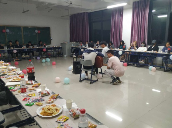 本次活动由五个班委主持、策划,地点考察,分配任务购买所需物品以及搬运布置。活动主要内容有游戏击鼓传花、抢凳子、运气球、摸盲盒,赢的同学有炭笔、糖果和小零食等奖品,输的同学惩罚是挑战面无表情吃柠檬。才艺表演分别有吉他伴唱、双人合唱、双人组合舞蹈以及模特走秀表演。班委检讨让同学说出班委有哪些方面没有做好加以改正,发言同学有小奖品。