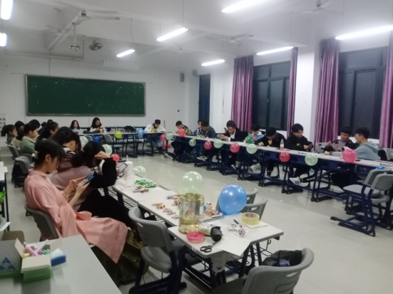 此次活动由节目表演和游戏环节两个部分。活动在伍琪同学的开场舞拉开了序幕,接着余陈蕴,黄佳怡,何永清等同学们带来了精彩的歌曲表演。表演过后就是游戏环节,此次活动游戏是以智力游戏与体力游戏相结合的,体力游戏是—抢凳子,抢凳子游戏即考验反应力和速度的,最后以欧阳春荣等4名同学获得了胜利。智力游戏是狼人杀,三国杀等桌游游戏,它能增加同学们之间的交流。