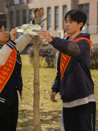 师生为树苗挂上标识牌