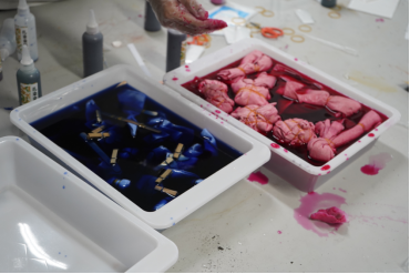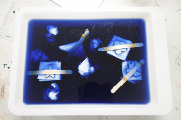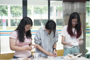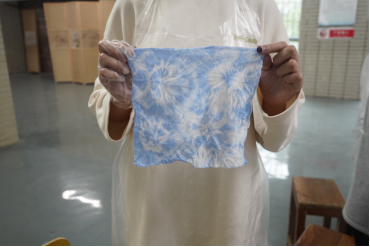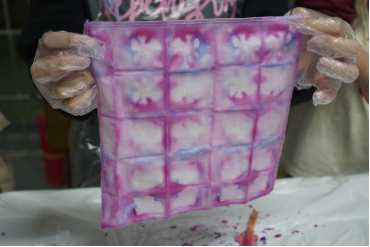 活动开始,潘嘉榕、黄晴同学为同学们介绍扎染艺术的历史渊源和工艺特点,并讲解扎染基本的技巧和步骤。随后,现场的同学们根据自己的创意和兴趣,设计了各种图案,并运用不同的扎结技巧和染色方法,创作出了独具特色的扎染作品。这些纹理和图案或如同山峦起伏、水流蜿蜒,或如同云朵飘荡、烟花绽放,充满了生机和活力。尽管初次尝试难免生疏,但每一份作品都承载着同学们的心血和热情。