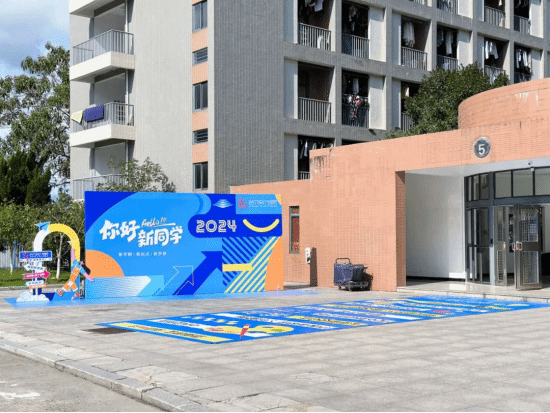 宿舍楼前精心布置的迎新现场