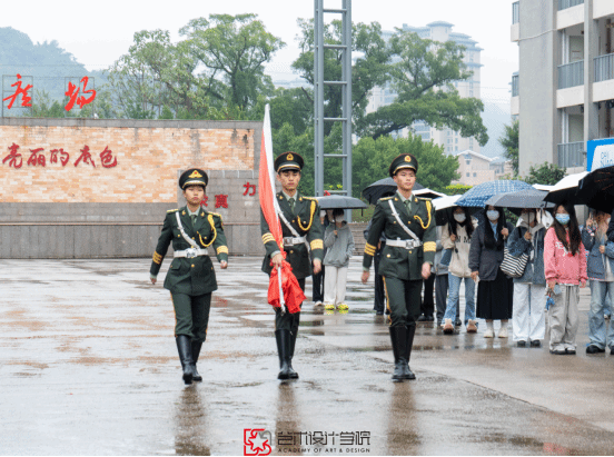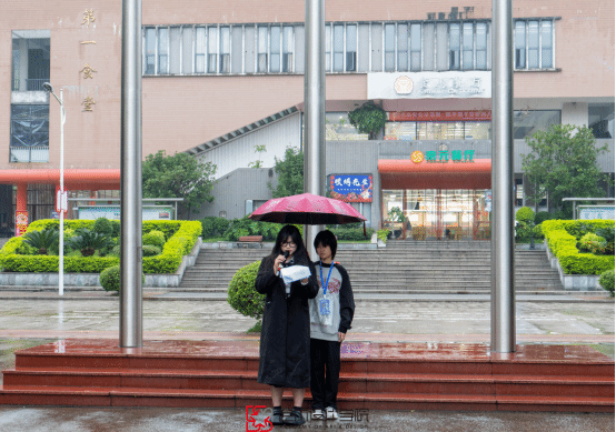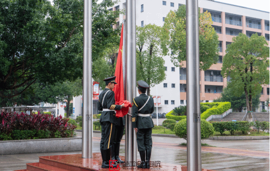 7时15分,升旗仪式正式开始。国旗护卫队迎着风雨,步伐铿锵、身姿挺拔,护卫着五星红旗迈向升旗台。在激昂的国歌声中,鲜艳的五星红旗冉冉升起,全体师生庄严肃立,行注目礼。