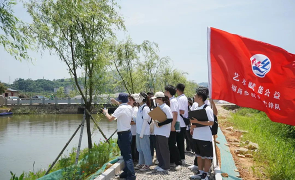 在东岱镇蝉步村,队员们跟随着老师的步伐,沿着河岸进行实地考察并实时绘制讨论方案,查看了水陆地势和水体流向后,结合当地的垂柳景观,先锋队成员提出了“春暮絮飞清影薄,夏初蝉噪绿阴多”的景观设计理念,对岸边的果蔬种植基地和栏杆石材也进行了分析,为后续设计方案打下坚实的基础。