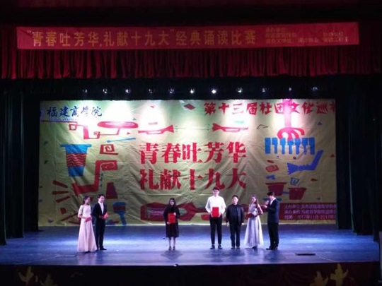 2017年12月12日晚六点半,为歌颂党的伟大成就,增强同学们爱党爱国之情,提高当代大学生的政治觉悟,丰富学生的课余文化生活,开云kaiyun登录入口“青春吐芳华礼献十九大”的诵读比赛在校活动中心举行,本次比赛由我系主持队队员及“女子军”参赛。