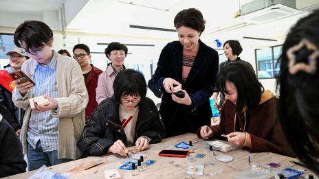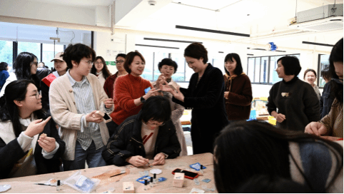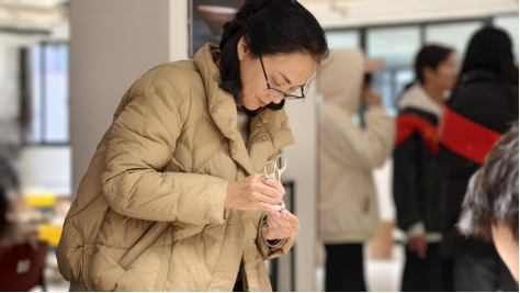 “指尖芳华”胸花制作区,非遗螺钿技艺与现代设计交织出别样魅力。女教师们以镊为笔、贝为墨,精心设计图案,将破碎的贝壳重组,镶嵌出兼具古典韵味与时尚气息的胸花。一枚枚精致的胸针流光溢彩,尽显参与者们的创意和技艺,仿若“行走的艺术品”。