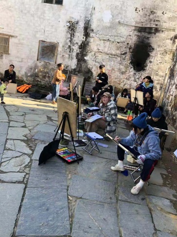 2018年11月25日至11月29日,开云kaiyun登录入口艺术设计系五名老师带领2018艺术设计学和环境艺术设计两个专业学生赴江西婺源进行色彩风景写生。第一天和第二天,老师带领学生在婺源县延村和思溪村进行写生和实地教学指导。第三天,去了附近的漳村。延村村名原称“延川延村幢清代商人建造的古民居,被誉为。历史上以商贾闻名的延村,现有房屋多为清代乾隆、嘉庆年间建筑,也有少量系明代所建。最兴旺时全村有四座祠堂,一百余栋大宅,村人如遇雨雪天气,由村头走到村尾,可穿堂入室而衣裳不湿,足见的规模。在思溪村中,建于清雍正年间的敬序堂,上堂悬挂鎏金匾额,厅内藻井为长方形,古色古香;屋内共有六个天井,尤以客馆的雕刻精细完美;书斋较简朴,面向庭园,甚为幽静。更为罕见者,是清乾隆间建的俞氏客馆,客馆内个不同字体(楷、行、草、隶、篆)的字组成的,格扇门上下均雕楼有人物戏文、鱼虫花鸟、水谢楼台等图案,堪称背靠青山,面临清溪和稻田,四周都是绿地,村庄与秀水青山的淡雅的美感。从远处看这些古民居,在外观上是大面积空白的一、面与点的对比效果,体现的意蕴,用了马头墙、山墙的建筑造型,尤其是马头墙屋檐角飞翘,在蔚蓝的天际勾画出民居墙头与天空的轮廓线,增加了空间的层次韵律美。民居建筑的显著特点是屋里都有天井,商业文化在天井建筑中得到完美体现。