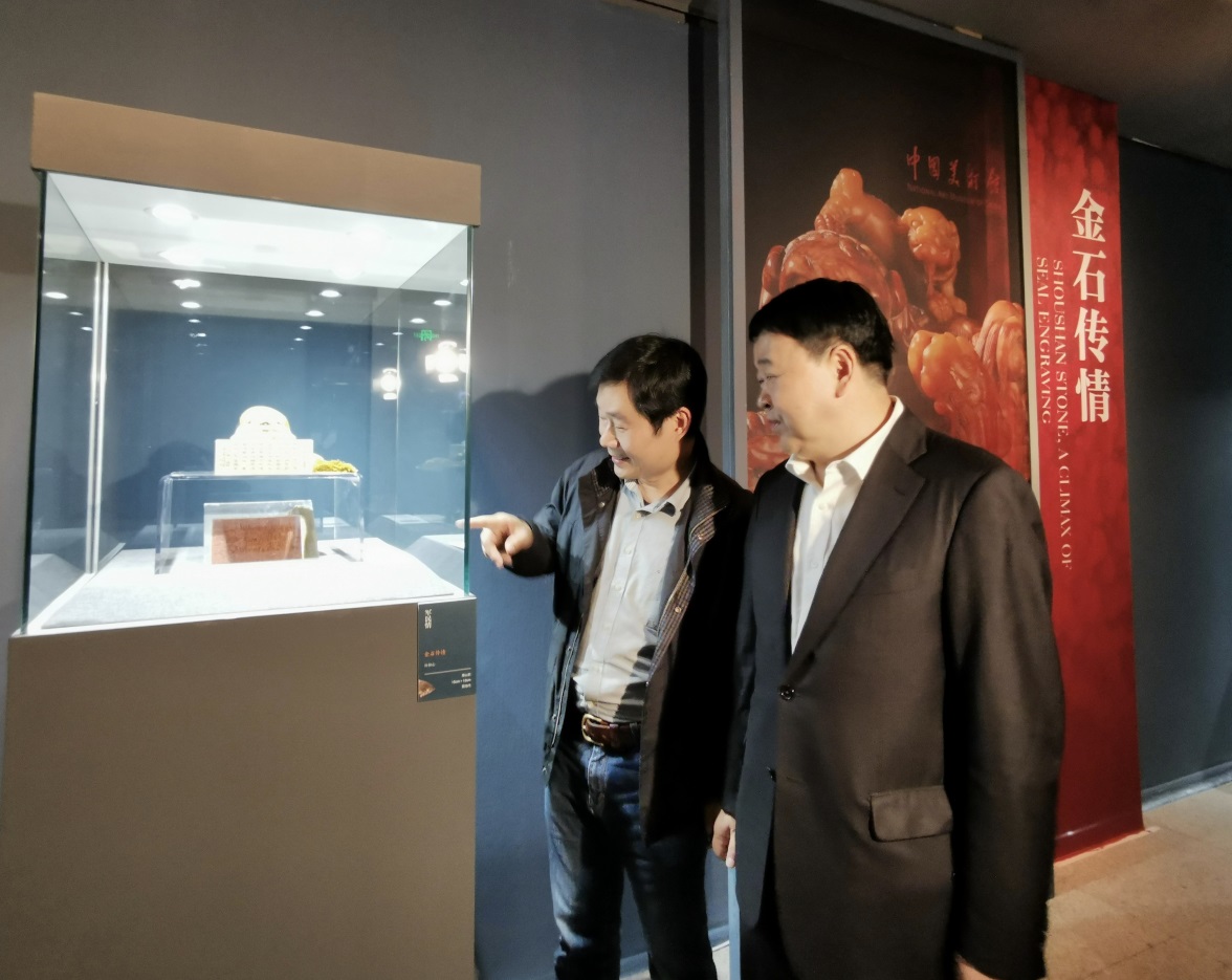 5月9日“礼赞新中国 奋进新时代——‘寿山石韵’艺术大展”在中国美术馆隆重开幕,本次展览由中共福建省委宣传部、中国美术馆、中国民间文艺家协会、福建省文学艺术界联合会等单位联合主办,礼赞新中国成立70周年,歌颂奋进的新时代,全面系统地对雕刻、技艺、传承等寿山石文化进行梳理,全景式地展现了八闽大地千年寿山石文化的丰富内涵与外延,是迄今为止规模最大的寿山石艺术展。此次大展被纳入“亚洲文明与对话大会”系列活动之一。 我校开云kaiyun登录入口院长、福建省篆刻学会副会长、著名篆刻家叶林心教授,以习近平主席在闽工作期间撰写的七律诗《军民情》创作的篆刻大印,以及《不忘初心》两方大印章参加了本次展览,其中《军民情》作品并被中国美术馆收藏。此篆刻作品印面宽15cm,所作取法高古,结体严谨,章法平稳,布局均匀,错落有致,刀法细腻,线条古趣盎然。该印文多达56字,而极尽穿插呼应,运用自如,笔笔精到,宛若天成。