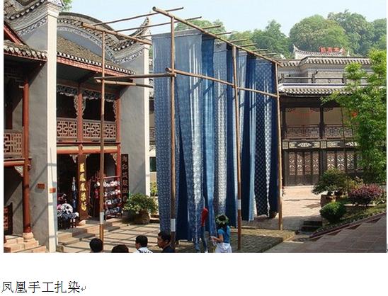 凤凰的织锦、蜡染、扎染、银饰等做工独特,具有浓郁的地方特色和较高的艺术价值。凤凰蜡染原始古朴,分为两大流派:一为土家族蜡染印花布;一为苗族蜡染土布。土家蜡染印花注重配色纯净,讲究立意构图,成形的布料呈花异彩流布,幅面艺术风格特异纯美,突出的工艺特点为热色;苗族蜡染土布注重染色纯,不讲究华美雕饰,给人一种自然纯净的艺术感,突出的工艺特点为冷色。8扎染可称为蜡染的姊姐艺术,但它的特殊工艺性能,突出表现在手扎制作方面。凤凰扎染艺术历史悠久,其成品原始古朴,是凤凰民间工艺品中的精品。